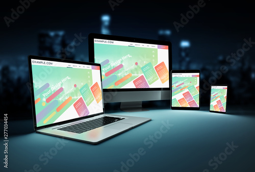 Modern devices with smartphone laptop computer and tablet in dark 3D rendering
