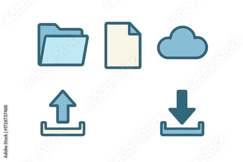 Modern digital data storage, cloud computing, and file transfer interface symbols and icons for web and mobile design projects