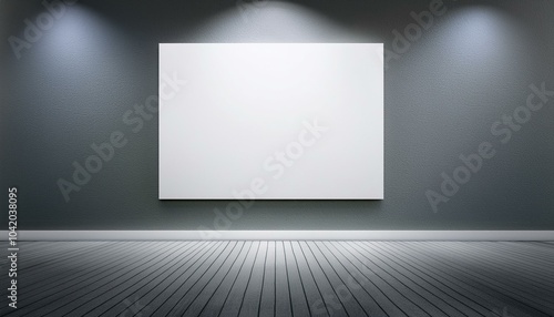 Modern empty gallery room interior with white mock up frame on illuminated light wall. 3D Rendering.