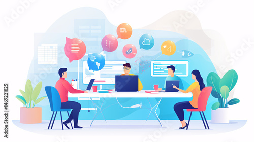 Modern flat vector illustration showing remote team working digitally from various locations using laptops and communication tools.