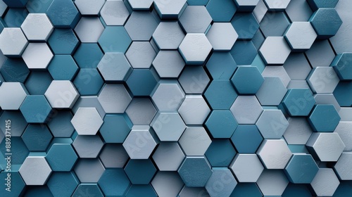 Modern hexagon pattern background with interlocking hexagonal shapes in varying shades of blue and gray, creating a sense of depth and complexity, ideal for tech-themed designs or adding a geometric
