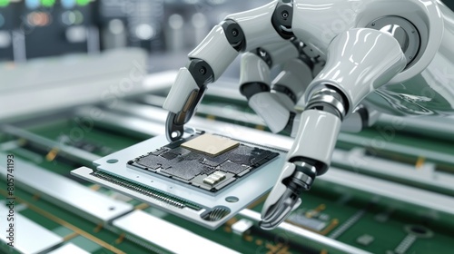 Modern, high-tech authentic robot arm precisely holding a contemporary supercomputer processor.