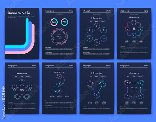 Modern infographic vector elements for business brochures. Use in website, corporate brochure, advertising and marketing. Pie charts, line graphs, bar graphs and timelines.