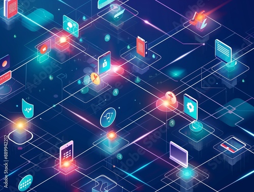 Modern isometric digital network with connected mobile and web icons.