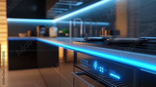 Modern kitchen with sleek design and ambient lighting.