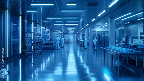 Modern Laboratory Interior with Workers in Protective Suits