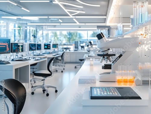 Modern Laboratory with Microscope and Test Tubes.