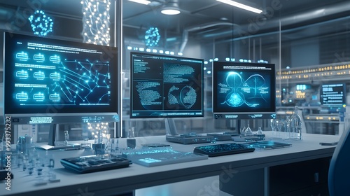 Modern Laboratory Workspace with Computer Monitors Displaying Data and Medical Scans