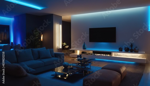 Modern luxury bed room night view blue led light