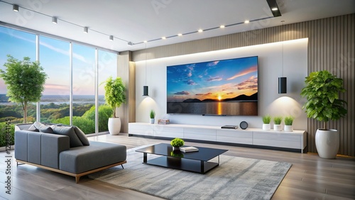 Modern Minimalist Living Room: Blank LED TV Screen Mockup on White Wall
