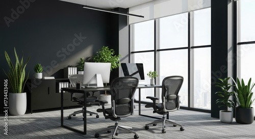 Modern Minimalist Open Plan Office Interior with Black Walls and Large Windows