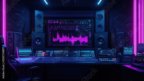 Modern music studio interior illuminated with purple and blue lights featuring sound mixing equipment and visual display of audio waveforms