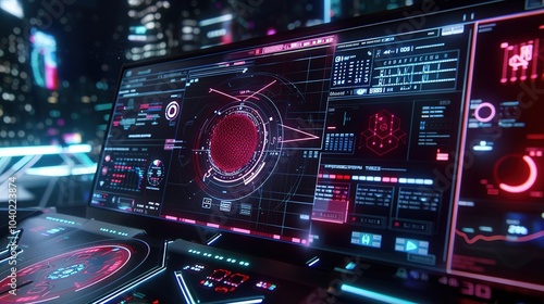 Modern Network Security Interface: Intricate Cyber Defenses, Encrypted Data Streams, Neon Cityscape Backdrop