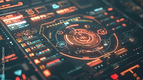 Modern Network Security Interface: Intricate Cyber Defenses, Encrypted Data Streams, Neon Cityscape Backdrop