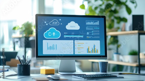 Modern Office Desk Computer Screen Showing Cloud Computing Data Analytics Graphs