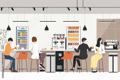 Modern Office Kitchen Break Area with Employees Enjoying Coffee and Conversation