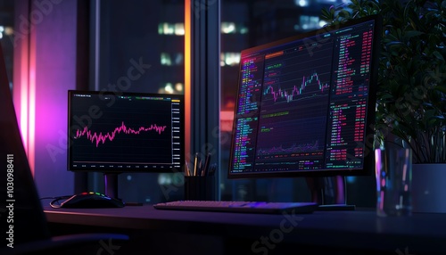 Modern office setup with dual monitors displaying financial market graphs at night, showcasing a vibrant trading environment.
