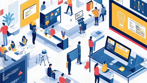 Modern office with people working on computers.