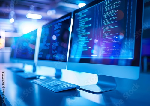 Modern Office Workspace with Computer Screens Displaying Code - Perfect for Technology, Programming, and IT Themes