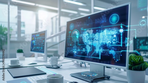 Modern Office Workspace with Futuristic Digital Interface on Computer Screen