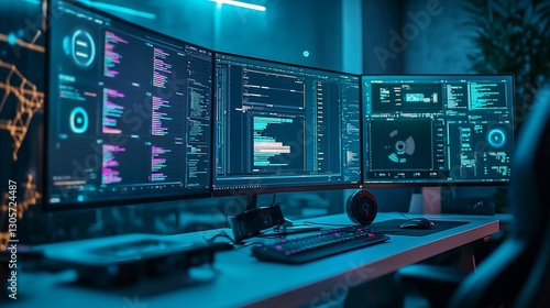 Modern programmer's workspace with three monitors displaying lines of code, keyboard, mouse, and headphones.