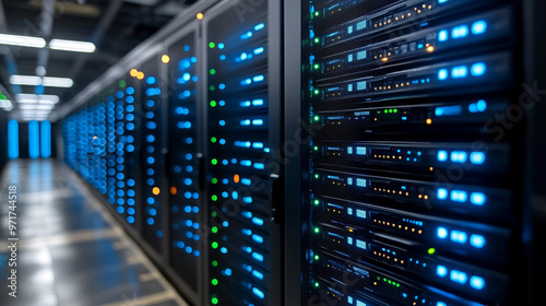 modern server racks in a high-tech data center, symbolizing network security, technology infrastructure, and efficient data management. A secure digital environment for cloud computing