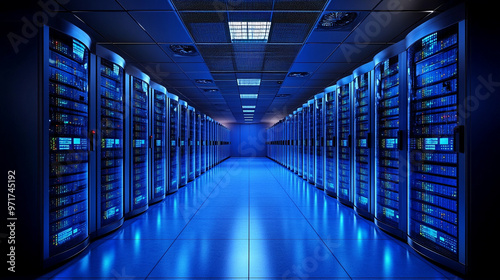 modern server racks in a high-tech data center, symbolizing network security, technology infrastructure, and efficient data management. A secure digital environment for cloud computing