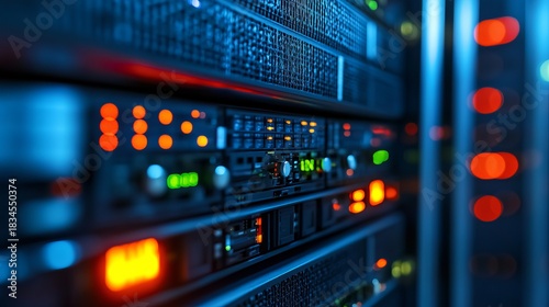 Modern server room with glowing lights shows powerful data infrastructure for technology solutions and cloud computing applications, a secure IT network