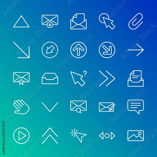 Modern Simple Set of arrows, cursors, email Vector outline Icons. Contains such Icons as button, mouse, office, mail, chat, up, up and more on gradient background. Fully Editable. Pixel Perfect.