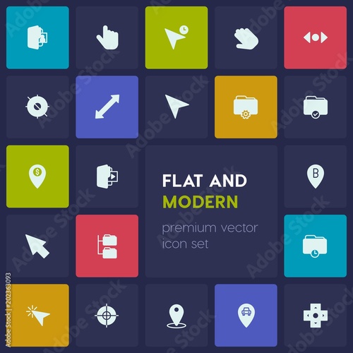 Modern Simple Set of location, folder, cursors Vector fill Icons. Contains such Icons as hand, folder, target, location, center, pointer and more on dark background. Fully Editable. Pixel Perfect