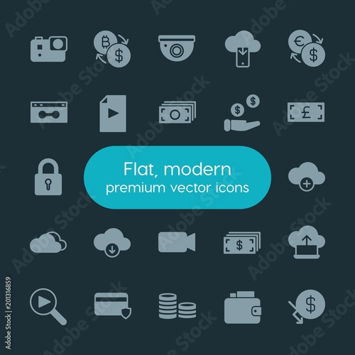 Modern Simple Set of money, cloud and networking, security, video Vector fill Icons. ..Contains such Icons as finance, cash, investment and more on dark background. Fully Editable. Pixel Perfect.
