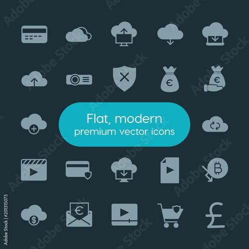 Modern Simple Set of money, cloud and networking, security, video Vector fill Icons. ..Contains such Icons as online, light, white, icon and more on dark background. Fully Editable. Pixel Perfect.