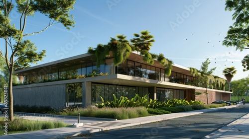 Modern Spanish building featuring a green roof