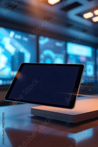 Modern Tablet Display with Sleek Design on a Futuristic Platform, Showcasing Technology and Innovation