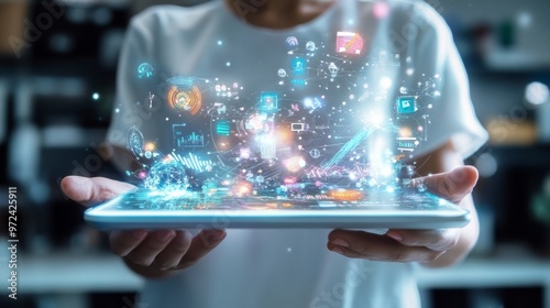 Modern Teacher Using Augmented Reality Tablet in Futuristic Classroom Setting
