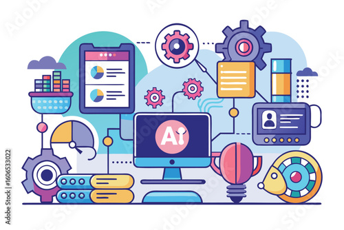 Modern technology and abstract concept of AI optimization with vector graphics depicting apps, tools, and data analytics in a creative workspace setup