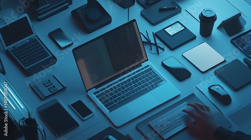 Modern technology workspace overhead view