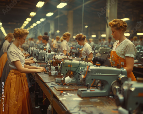 Modern Textile Factory Floor with Busy Workers Operating Sewing Machines, Side View