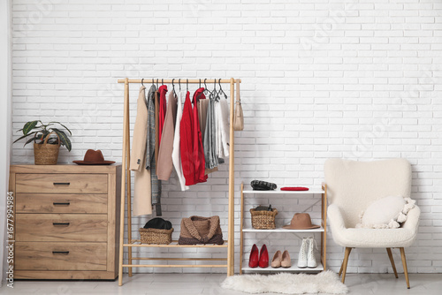 Modern wardrobe with stylish winter clothes and accessories