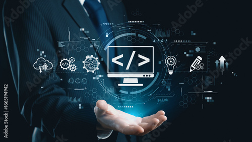 Modern web development concept featuring coding symbols, web development process, web development interface, and web development tools with futuristic design. Elide