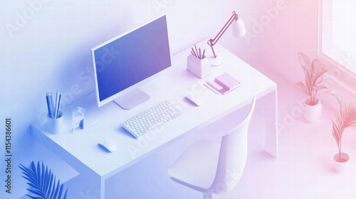 modern workspace featuring white desk, computer, and plants, creating serene and productive environment. soft pastel colors enhance calming atmosphere
