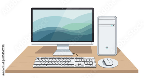 Modern workspace illustration featuring desktop computer setup on wooden table