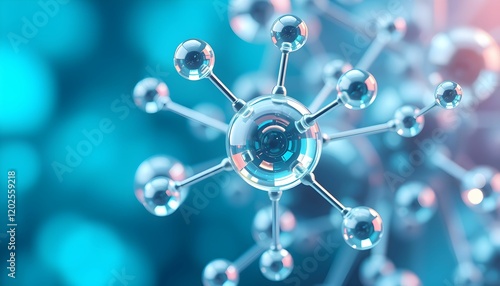 molecular structure, microscopic view, 3D render, spherical nodes, connecting rods, blue gradient background, scientific visualization
