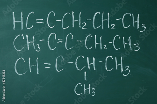 Molecule models and formulas on blackboard background