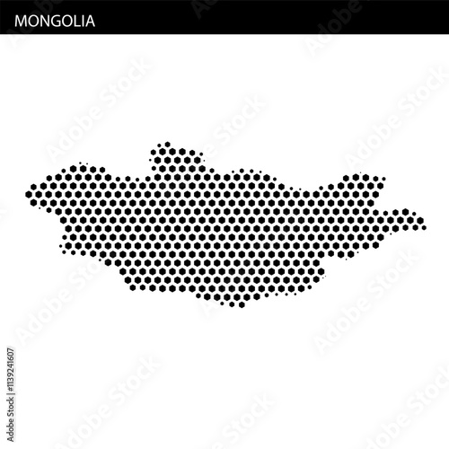 Mongolia highlighted on a hexagonal dotted map representation with abstract design elements