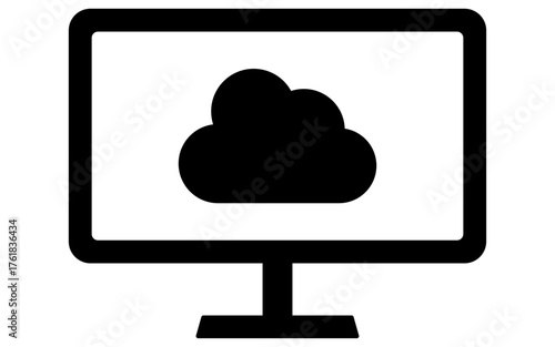 Monitor connected to cloud line icon with cloud network symbol, black and white