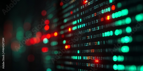 Monitor Displaying Multiple Code Lines and Data Analytics in a Dark Room with Red and Green Lights, Ideal for Tech and Cybersecurity Themes