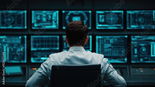 Monitoring cybersecurity threats control room digital display high-tech environment rear view data analysis insights