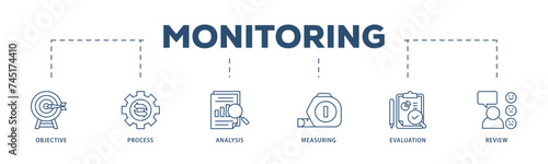 Monitoring icons process structure web banner illustration of objective, process, analysis, measuring, evaluation and review icon live stroke and easy to edit