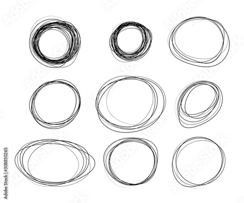 Monochrome circles, square, sketch, selection. Hand-drawn, scribbled. Design elements isolated on a light background.